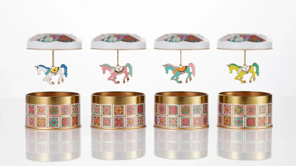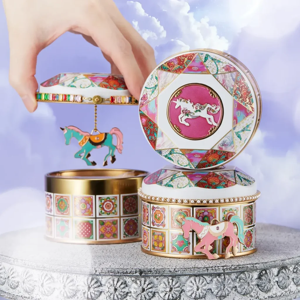 メリーゴーランドのようにチャームが現れる“仕掛け缶”は、ギフト映え抜群。