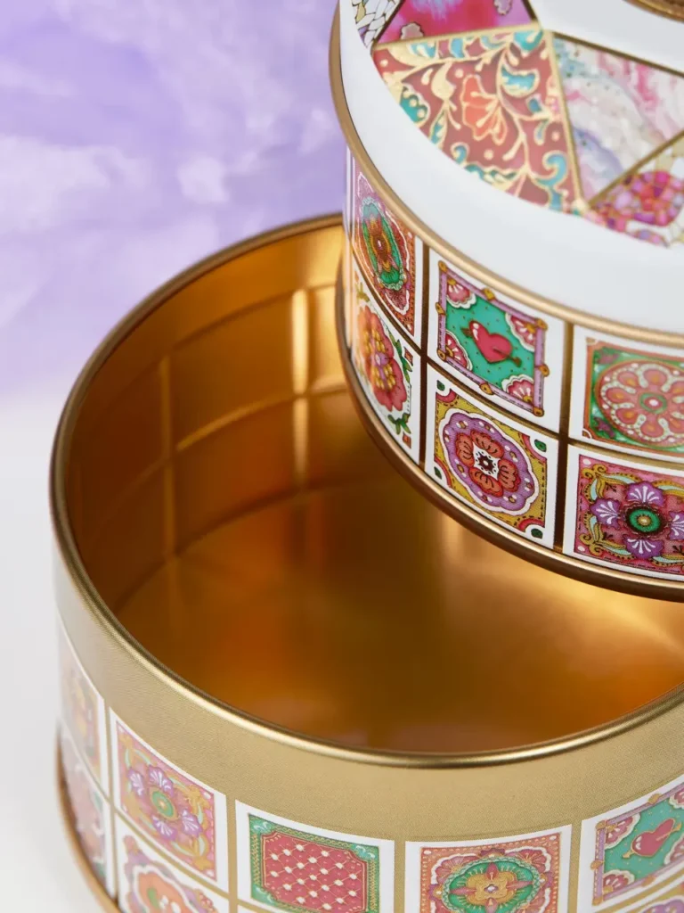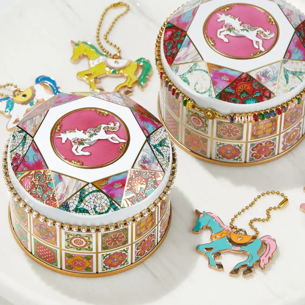 ふたを開けた瞬間、メリーゴーランドのようにユニコーンチャームが現れるドリーミーな仕掛けと、タイルのような質感を再現した缶デザインが話題を呼びそうです。