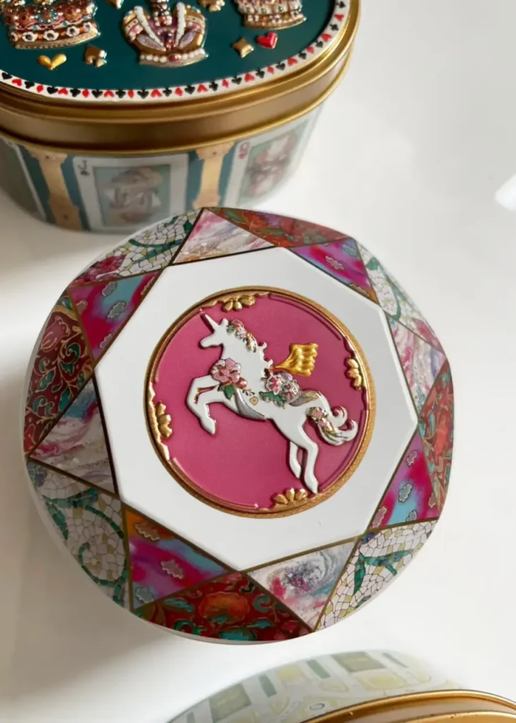 ガラス絵で描かれたユニコーンが虹色の空を駆ける幻想的なビジュアルで、ふたのダイヤカット部分には“夢の城”や“虹のタイル”がきらめきます。
