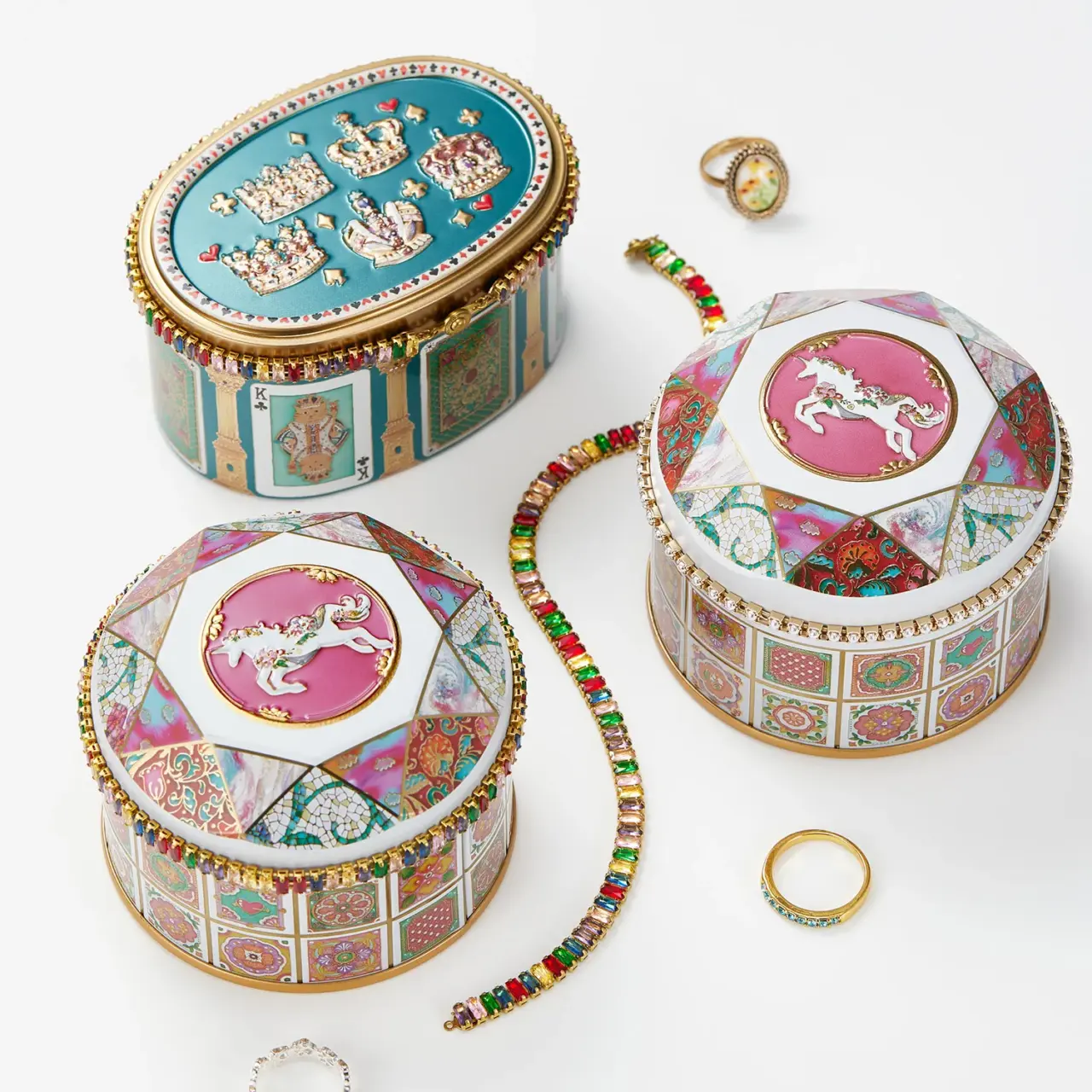 ガラス絵で描かれたユニコーンが虹色の空を駆ける幻想的なビジュアルで、ふたのダイヤカット部分には“夢の城”や“虹のタイル”がきらめきます。