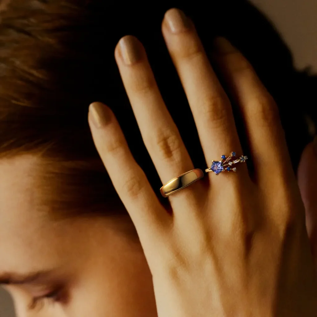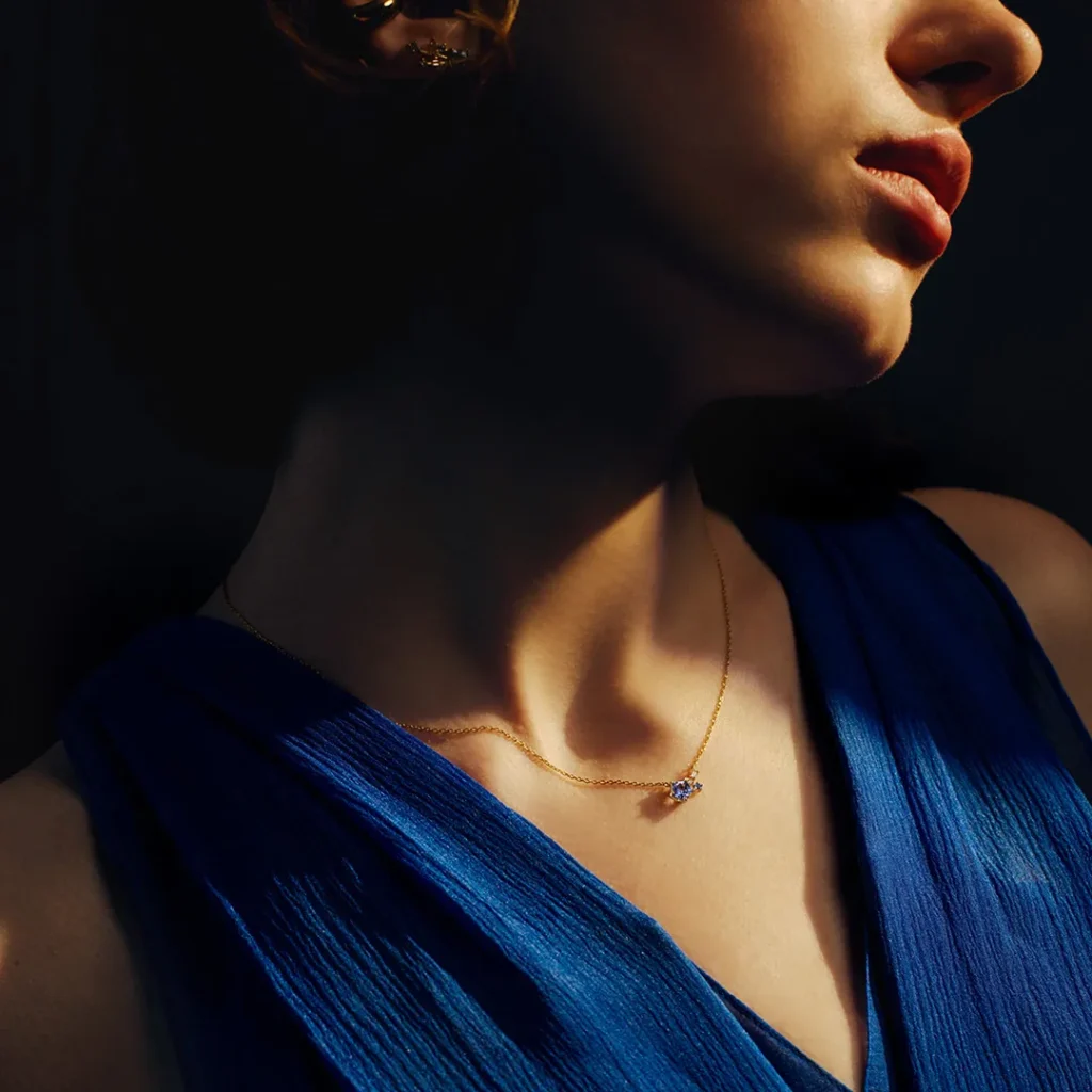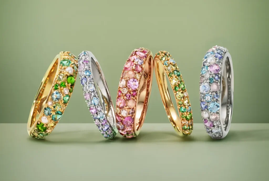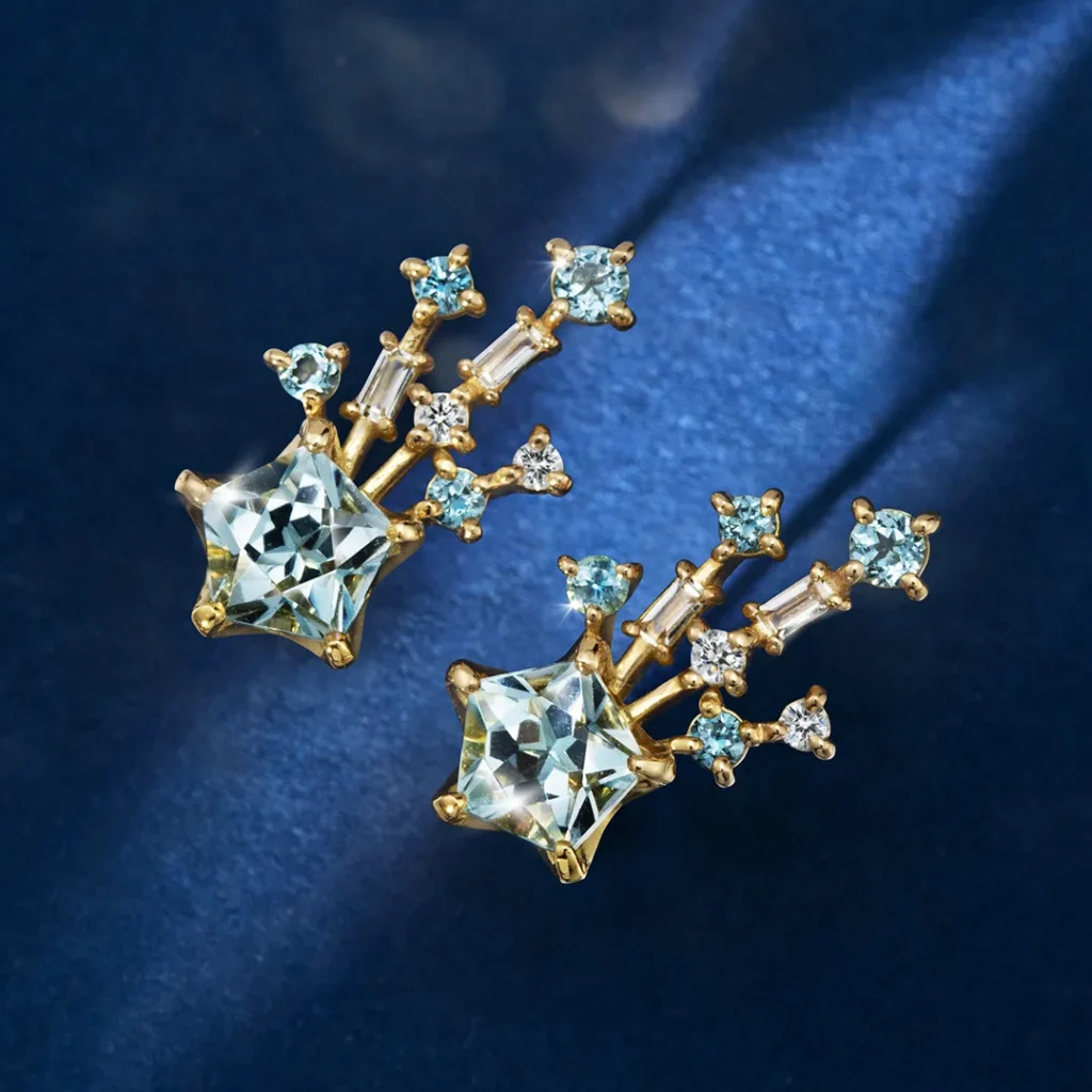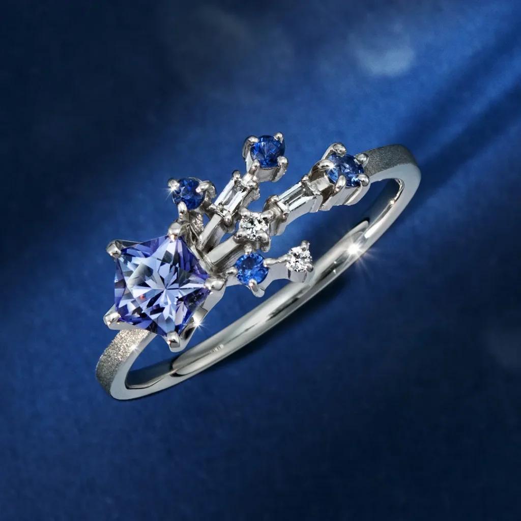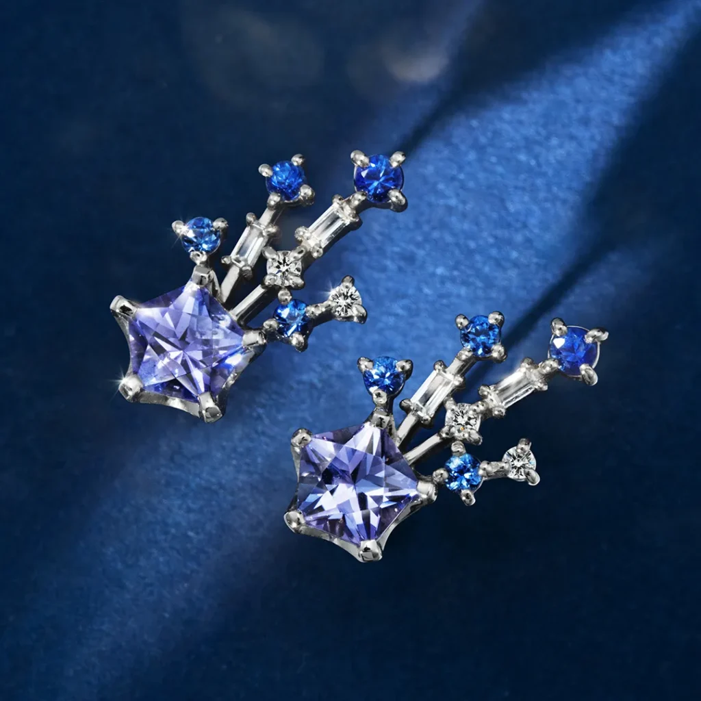 カラーは ディープブルーの「タンザナイト」 と 透明感あふれる「ブルートパーズ」 の2色展開。いずれもマルチカラージュエルを組み合わせ、立体的でリズミカルな輝きを演出します。