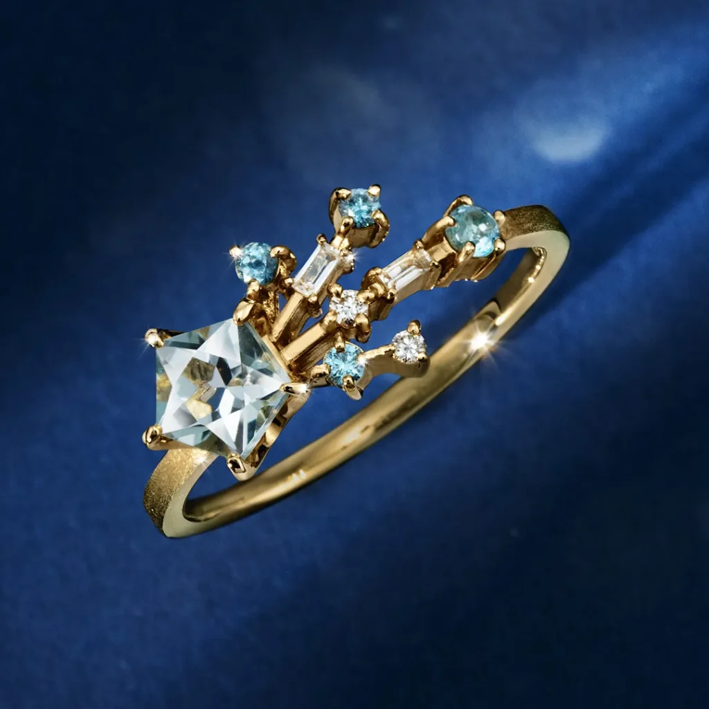 「ステラベル」は、幸せを自ら掴み取る大人の女性に向けたエールを込めたジュエリー。ペンタゴンカットの主石が放つ輝きに、ダイヤモンドやサファイアを組み合わせ、流れ星が軌跡を描くような繊細なデザインに仕上げています。石座の裏には星の透かし模様を忍ばせ、熟練の職人によるクラフトマンシップが光ります。